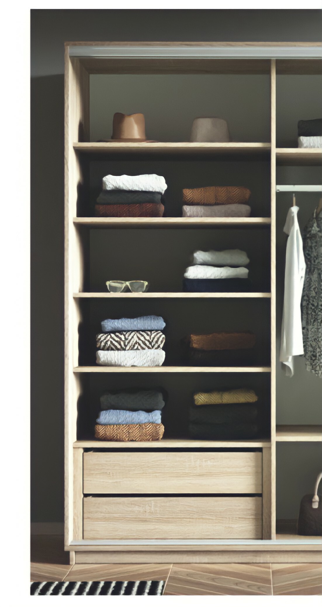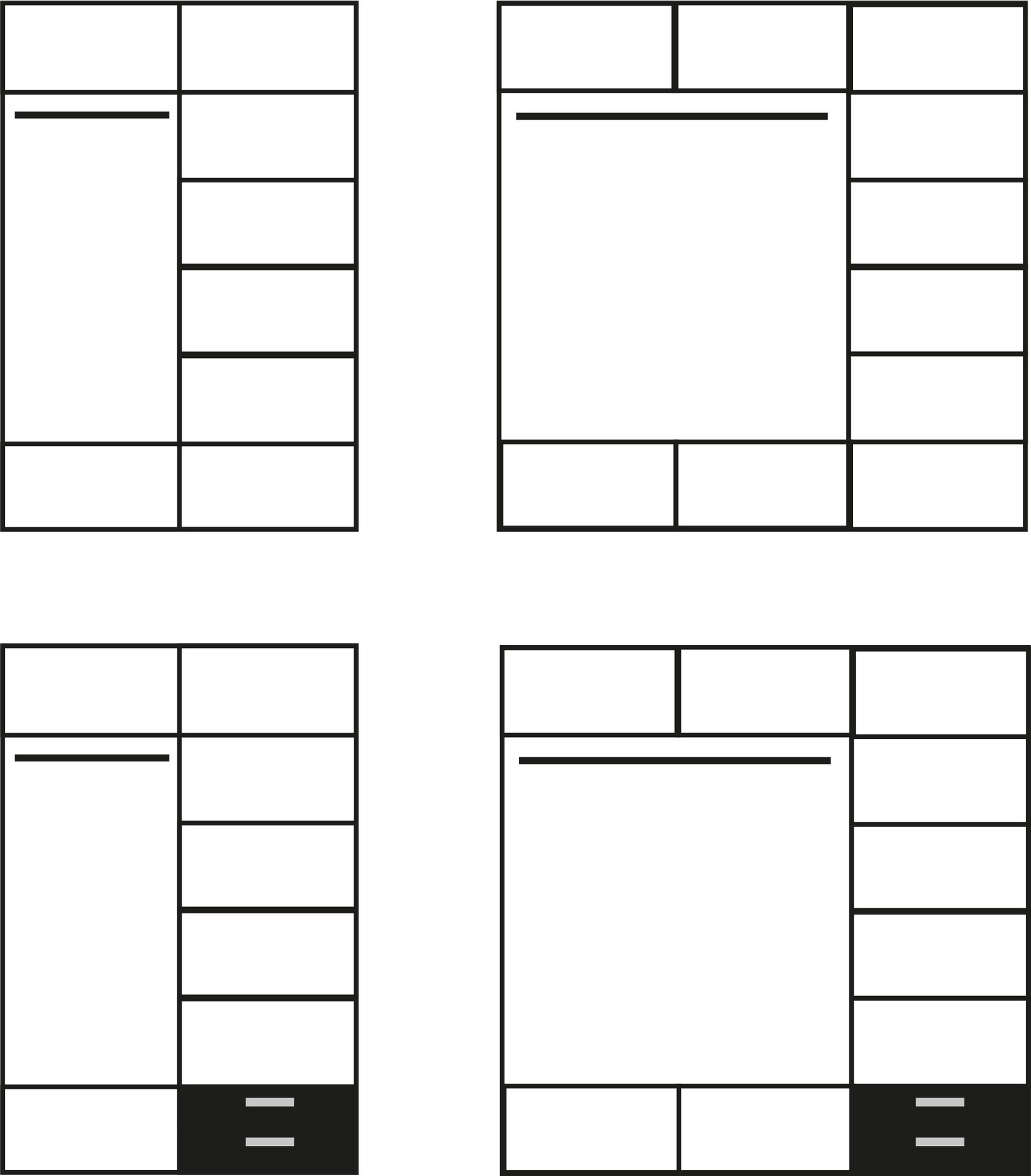 Any wardrobe of PRIME series can be supplemented with standard modules consisting of 2 drawers. The module can be installed in any section at any level, but the recommended placement is the lower section of the right unit (with five shelves).